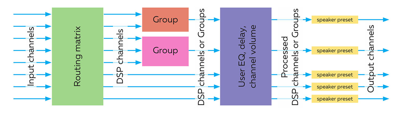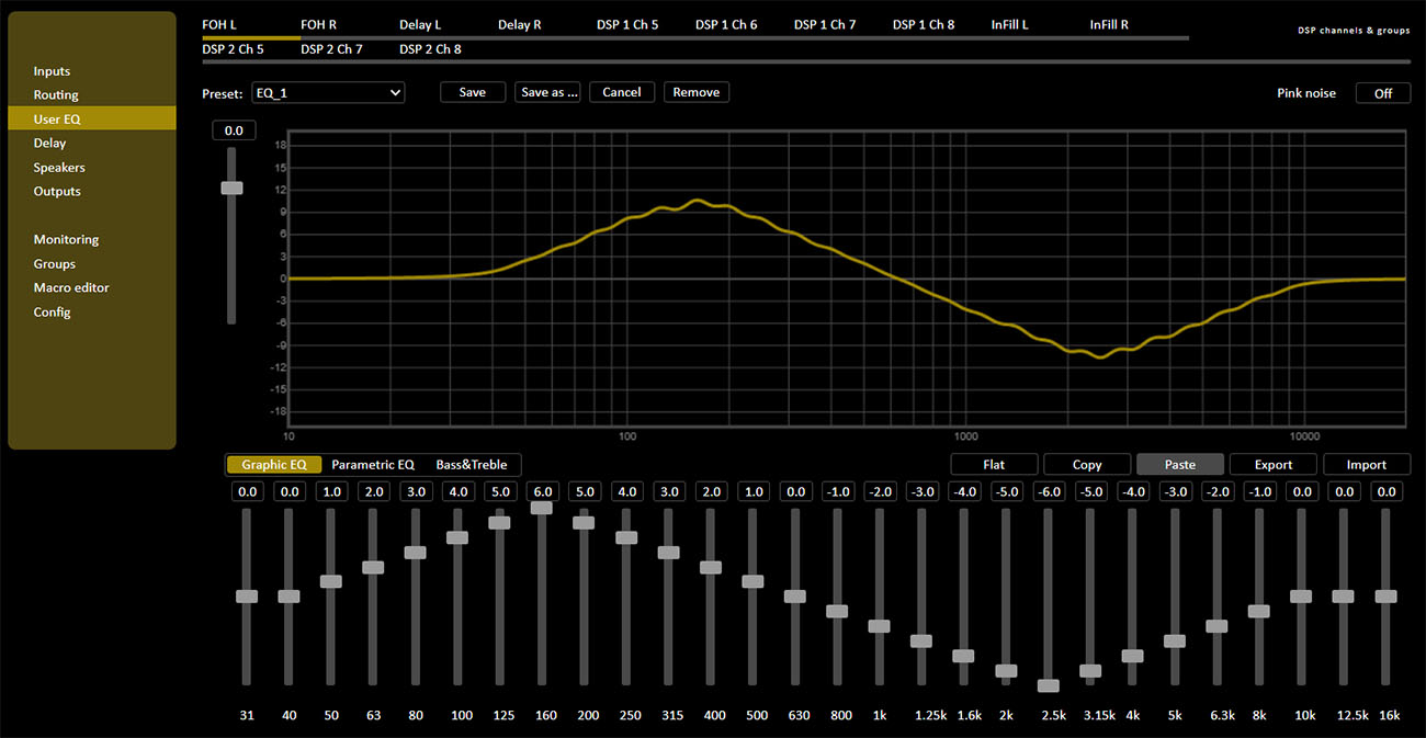 Можливості DSP DANA PRO включають гнучку матрицю маршрутизації (вільний розподіл до 8 аналогових та 16 цифрових входів AES3 між усіма виходами), користувацькі налаштування еквалайзерів (графічного 1/3 октави та параметричного) для корекції АЧХ приміщення, налаштування затримки (delay), групування каналів та створення макрокоманд для зручного керування зонами або сценаріями, моніторинг стану системи (рівень сигналу, температура, статус каналів), а також загальне керування (майстер-фейдер, mute, standby тощо) в реальному часі.